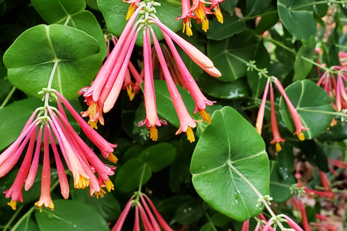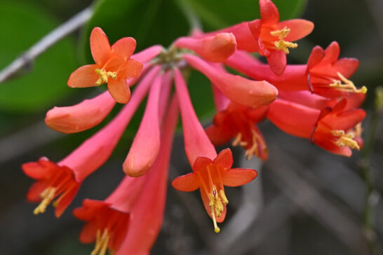 ハニーサックル(honeysuckle)というのは近縁種であるニオイニンドウ(Lonicera periclymenum)の英名で、英語圏ではツキヌキニンドウはコーラル・ハニーサックルと呼ばれています。