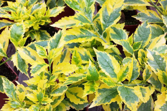 主に葉を楽しむ植物として、斑入り葉品種、黄金葉品種なども流通します。